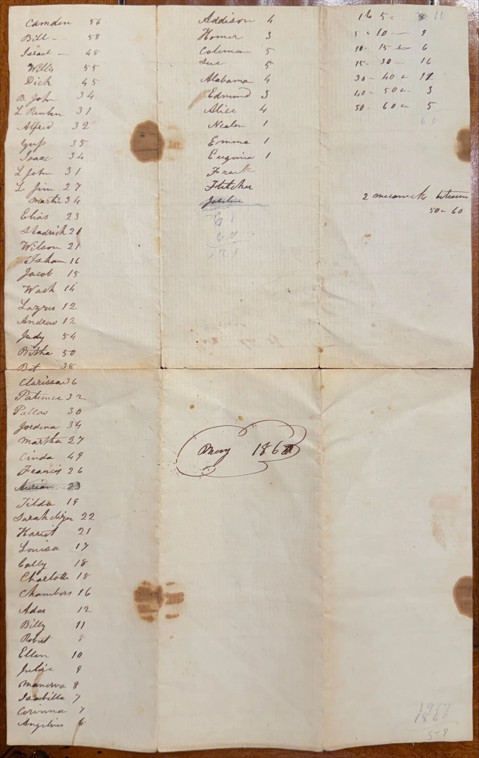 Writing is the central act. As a fifth-generation descendant of a woman who was denied literacy under enslavement, Thomas approaches this labor as custodianship, reclaiming writing as an assertion of sovereignty rather than control. The ages recorded on the list range from no age noted - suggesting infants - to children and adults, with the oldest person listed at fifty-eight years old. The absence of elderly people on the list makes the violence of enslavement visible as a system that brutalized and shortened lives, rendering old age largely unattainable, and elderly human beings expendable.